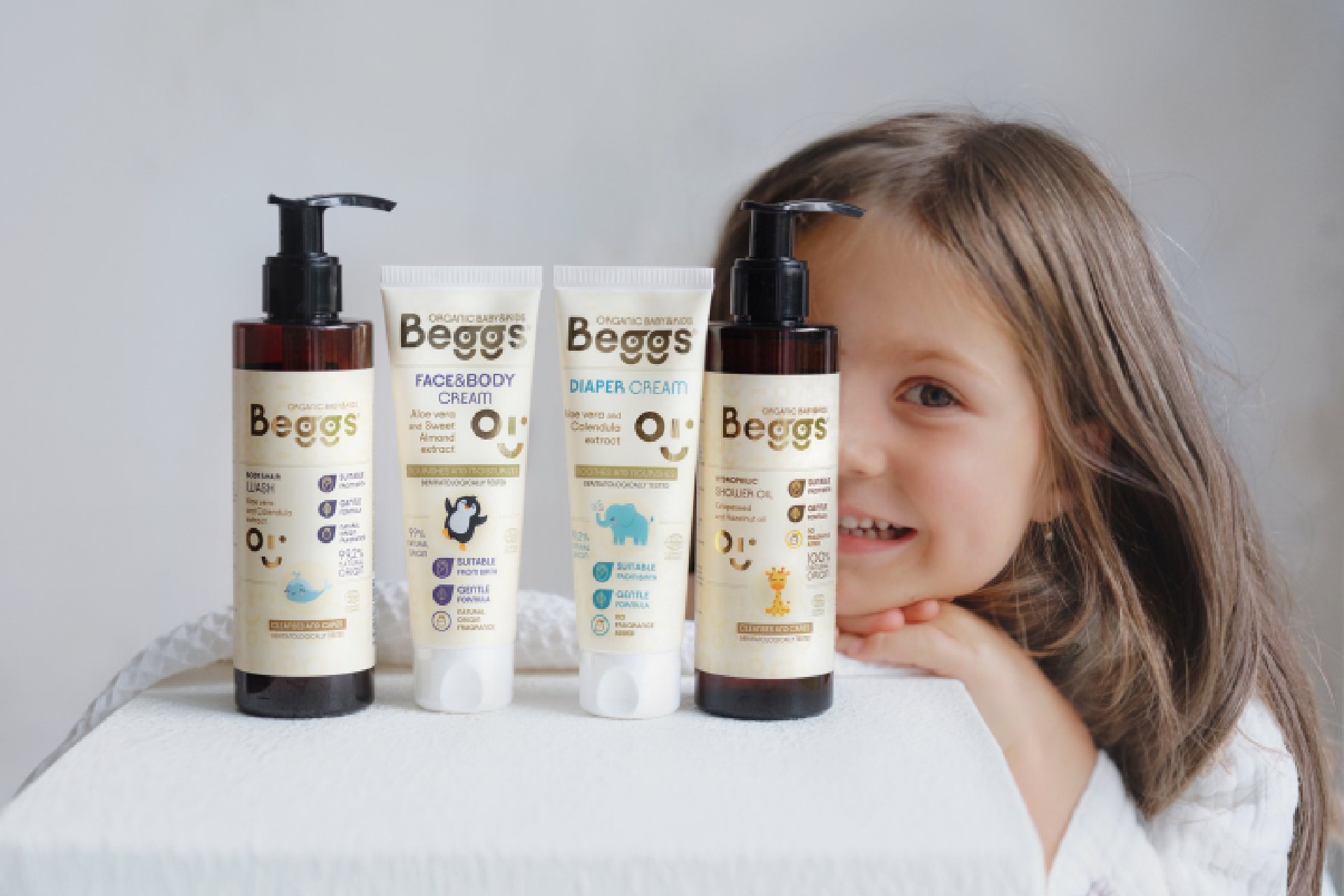 For daily care, it is important to choose suitable cleaning and care products that do not dry out the skin and at the same time support its natural protective barrier. Beggs cosmetics are gentle on delicate baby skin, dermatologically tested and are proud of the COSMOS Organic certificate, which guarantees that the product contains at least 95 % of natural ingredients and at least 20 % of the ingredients (10 % for rinse-off products) are from certified organic farming (BIO).